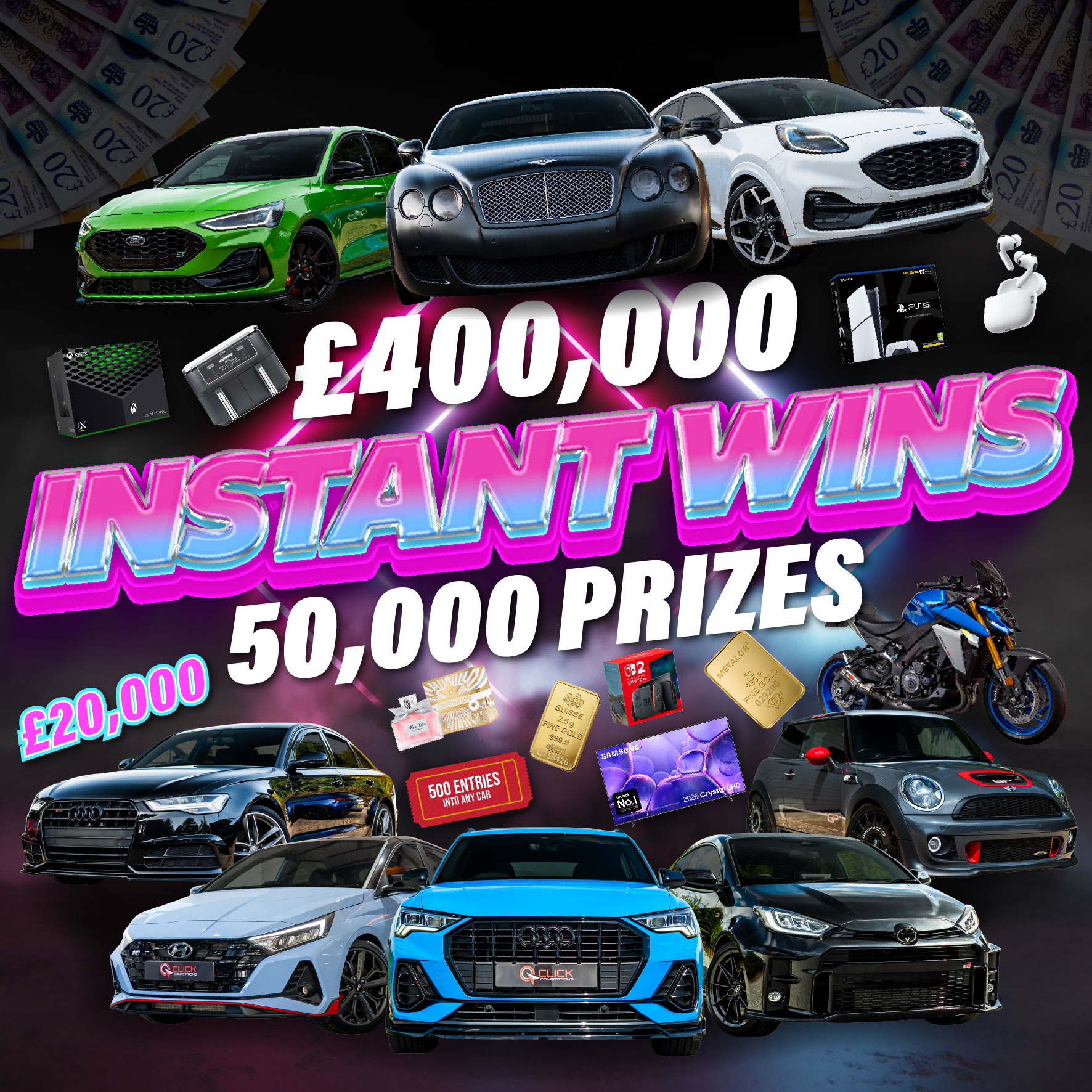 8x Cars | 1x Superbike | £20,000 | 20x £1,000 | 10x £500 | 50x £100 | 50x £50