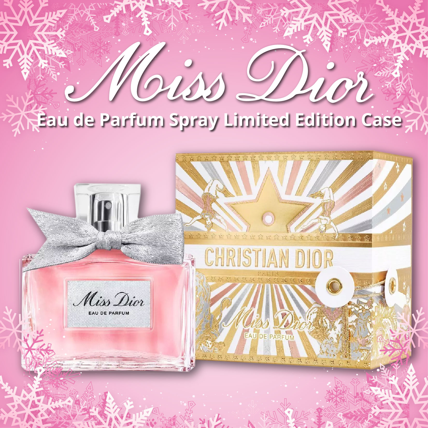 Miss Dior Eau de Parfum, the women’s fragrance with a colored bow, is housed in a limited-edition gift case adorned with a radiant Dior star and a cast of characters inspired by the circus Christian Dior held so dear.